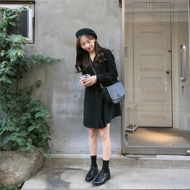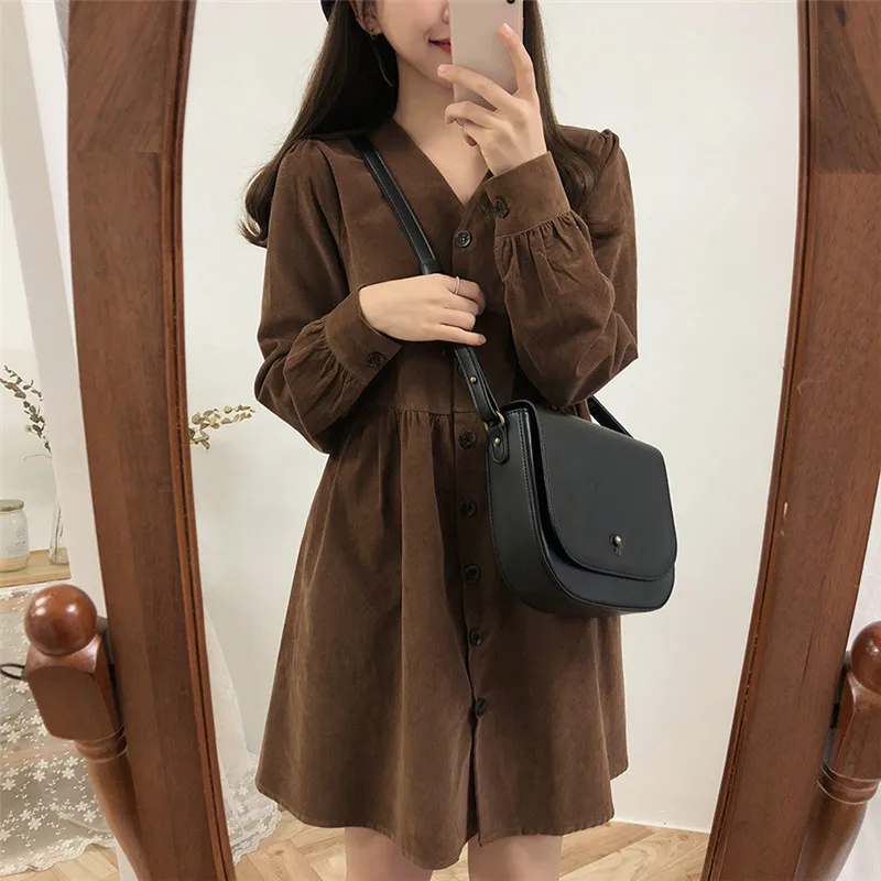 Special Offer Harajuku Retro cuello en V vestido de pana suelto de manga larga vestido de muñeca dulce mujeres de un solo pecho Otoño Invierno vestido de fondo Discount 5% Today!