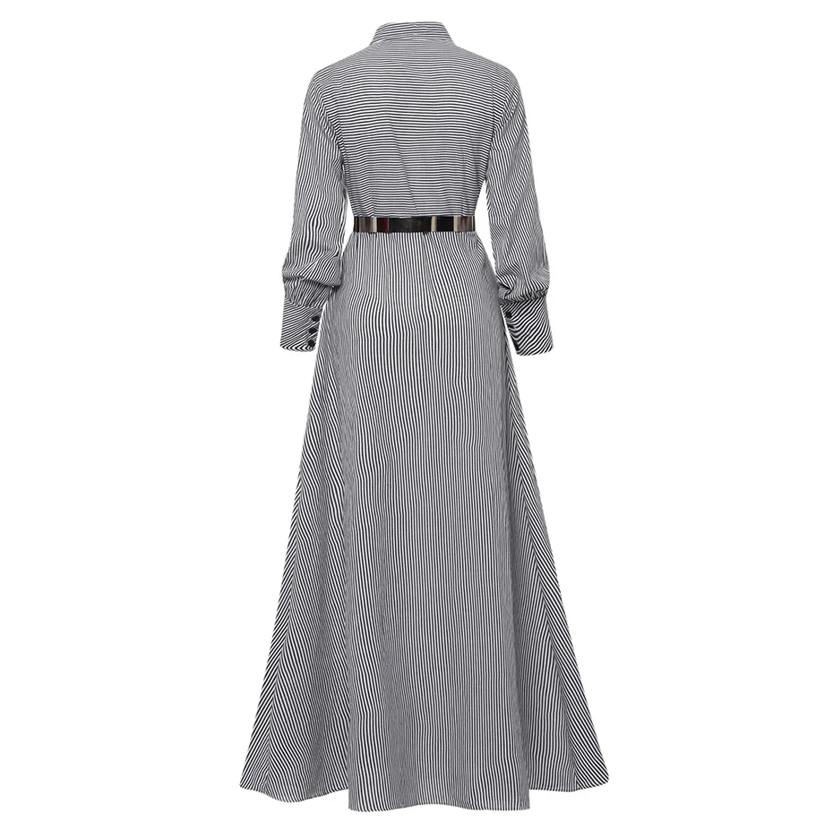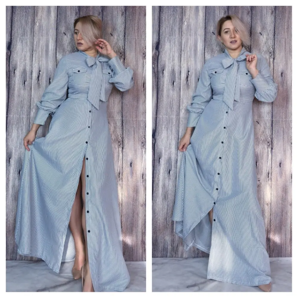 Special Offer Vestido largo a rayas largo hasta el suelo con lazo de manga larga vestido de botones suelto con bolsillos de otoño elegante Línea A vestido largo Casual para mujer Discount 55% Today!