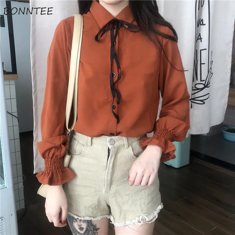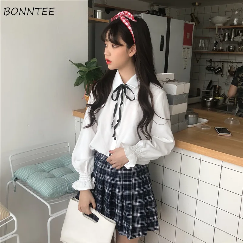 Special Offer Camisas para mujeres 2019 estudiantes de escuela encantadora manga de linterna camisa de mujer cuello vuelto estilo coreano Simple ocio mujeres Chic Discount 5% Today!