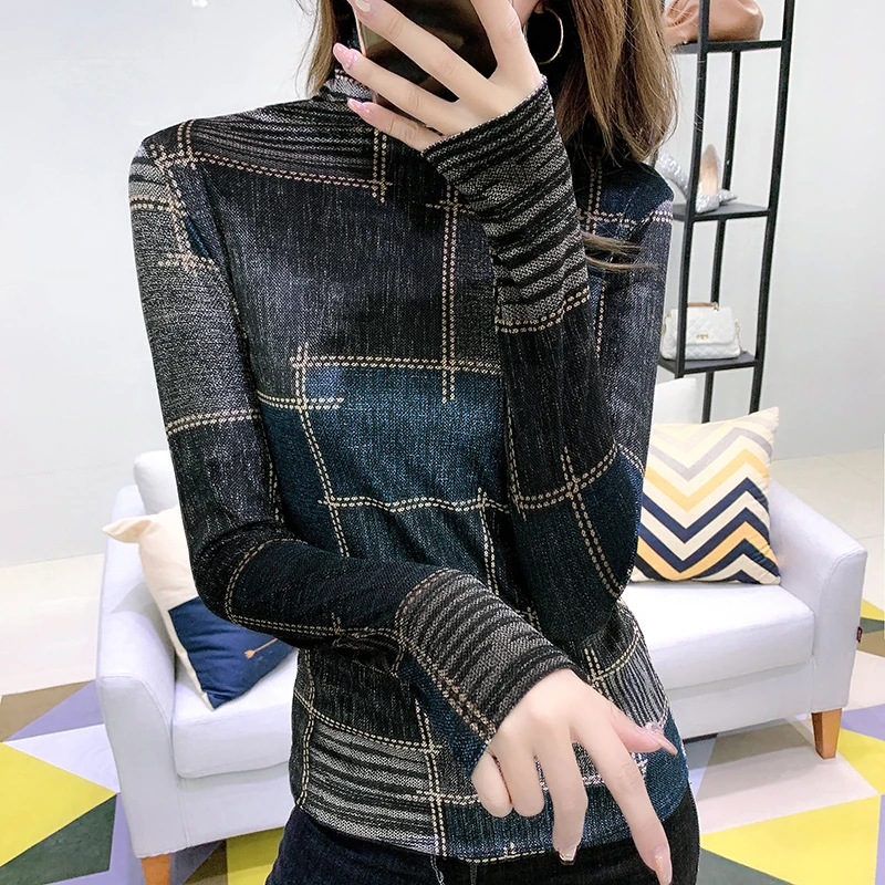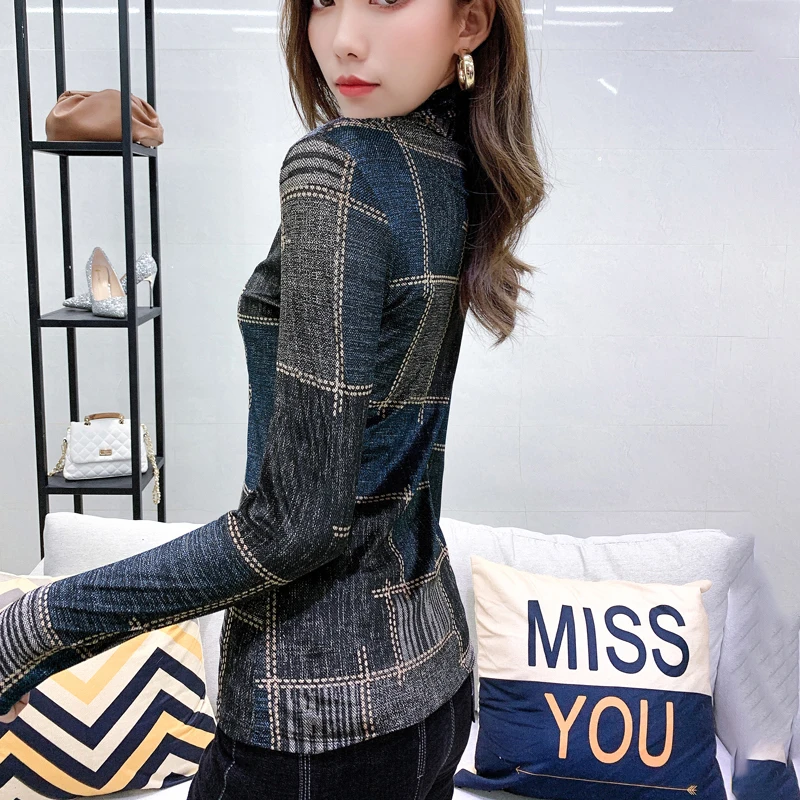 Special Offer 2019 Otoño Invierno de cuello alto de manga larga de terciopelo de fondo camisa streetwear de cuello alto plaid camisetas femeninas ajustadas camisetas de mujer Discount 0% Today!
