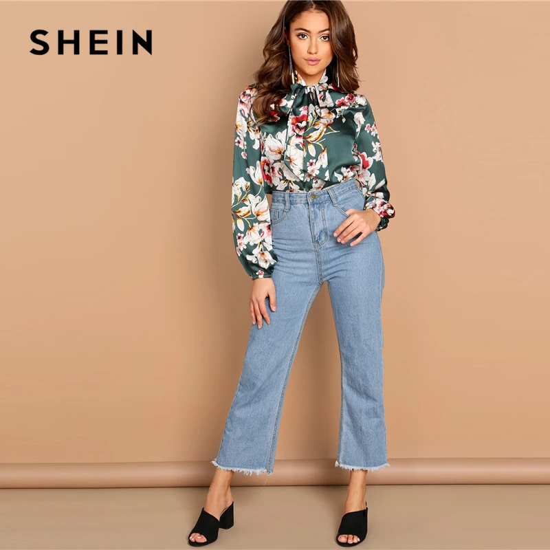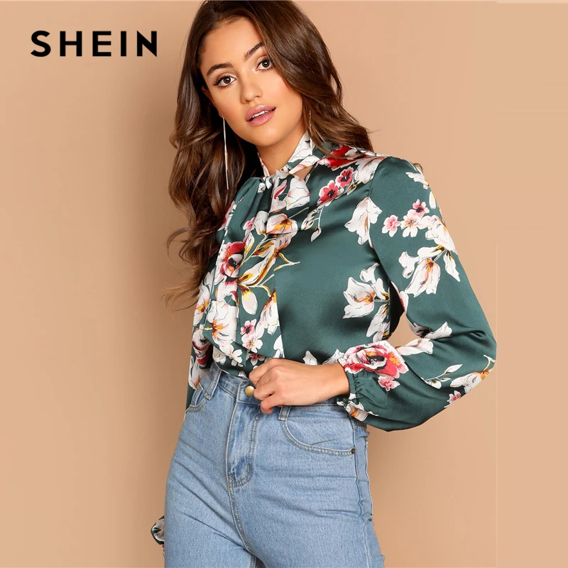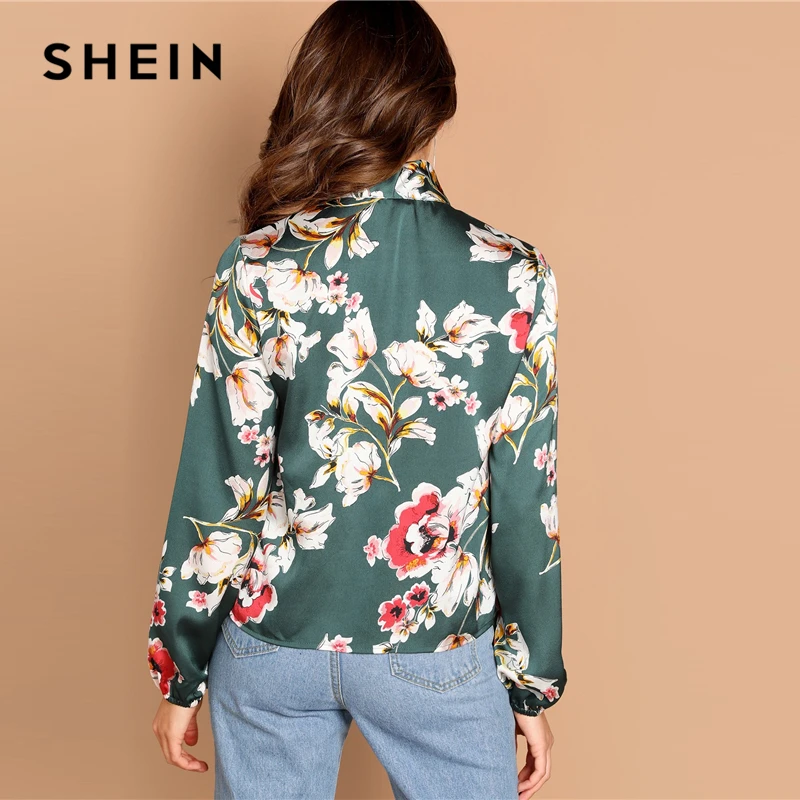 Special Offer SHEIN verde corbata cuello Floral cuello de pie Blusa de manga larga moderna señora 2019 primavera mujer Streetwear otoño minimalista blusa Discount 41% Today!